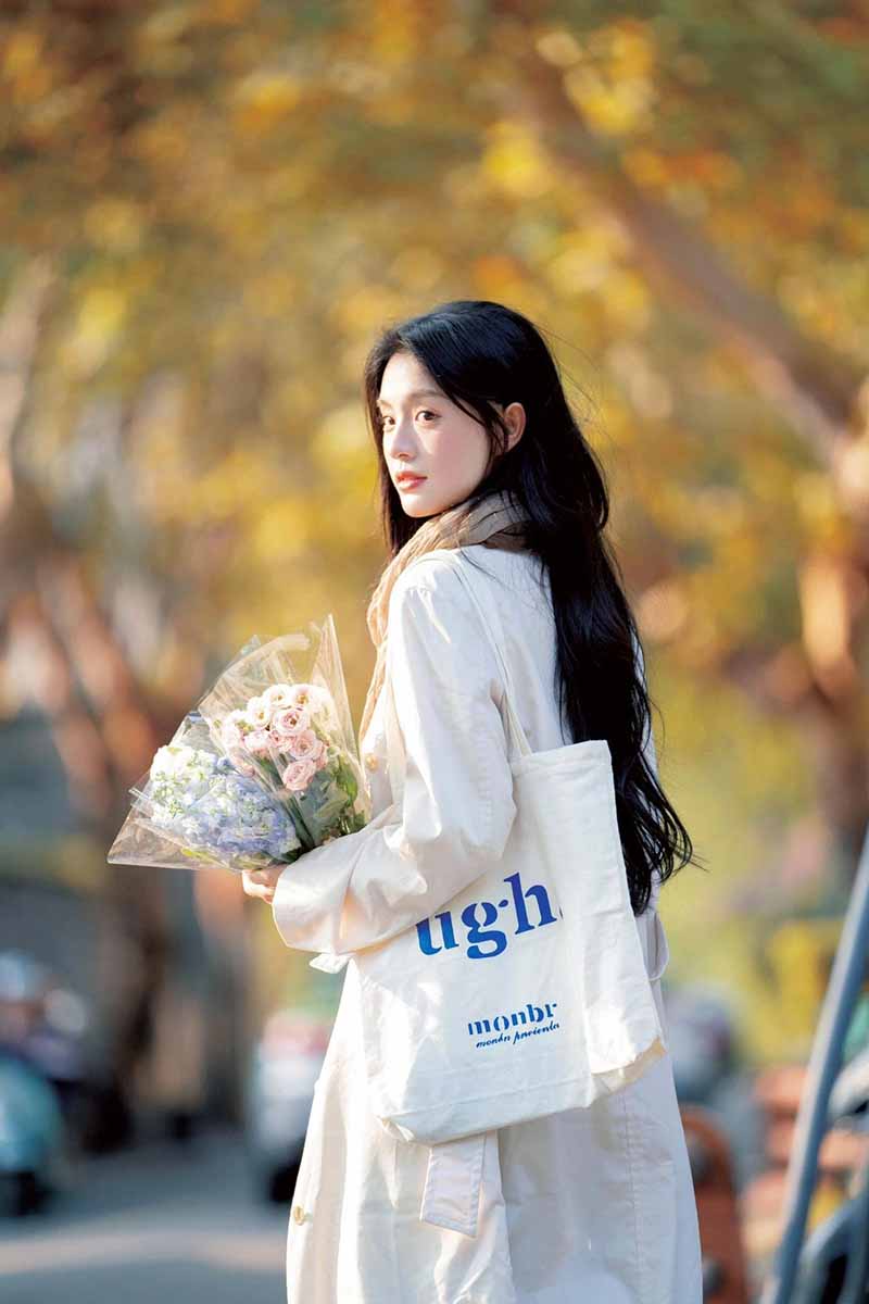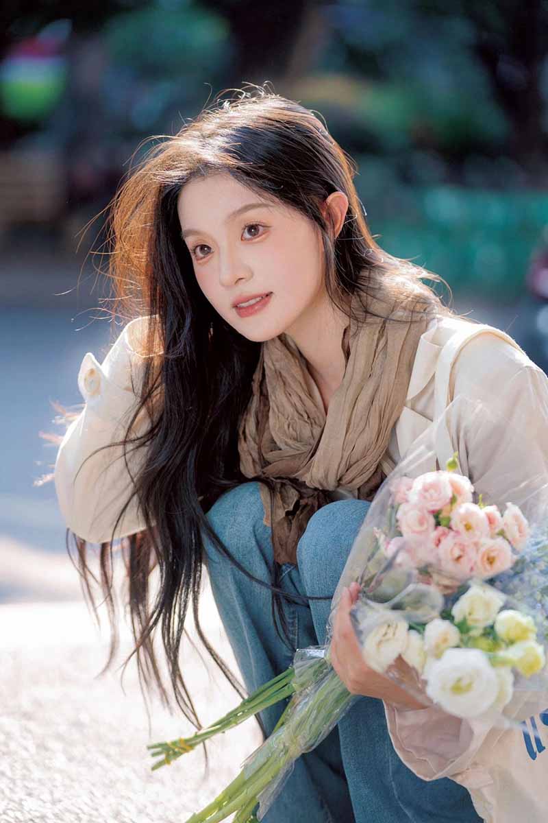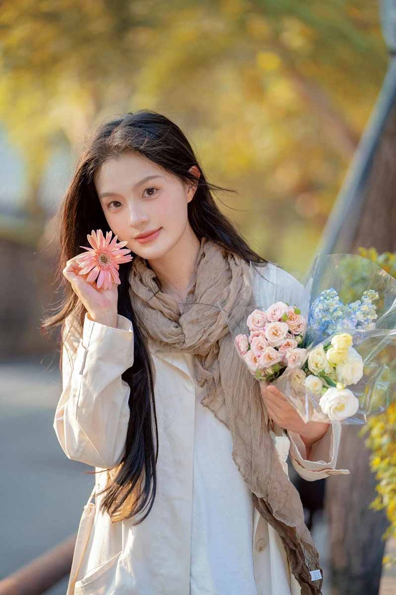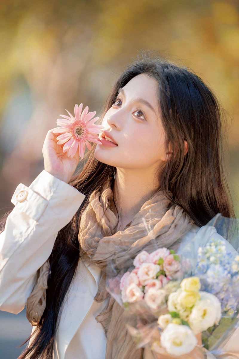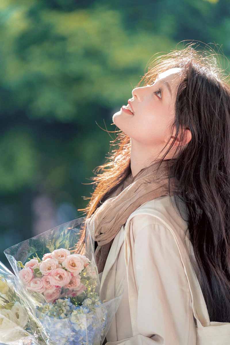 9、背景虚化:可以选择一些背景比较简洁的地方,比如白色的墙壁、绿色的树叶等,让背景虚化,突出模特和鲜花,营造出一种清新、文艺的氛围。