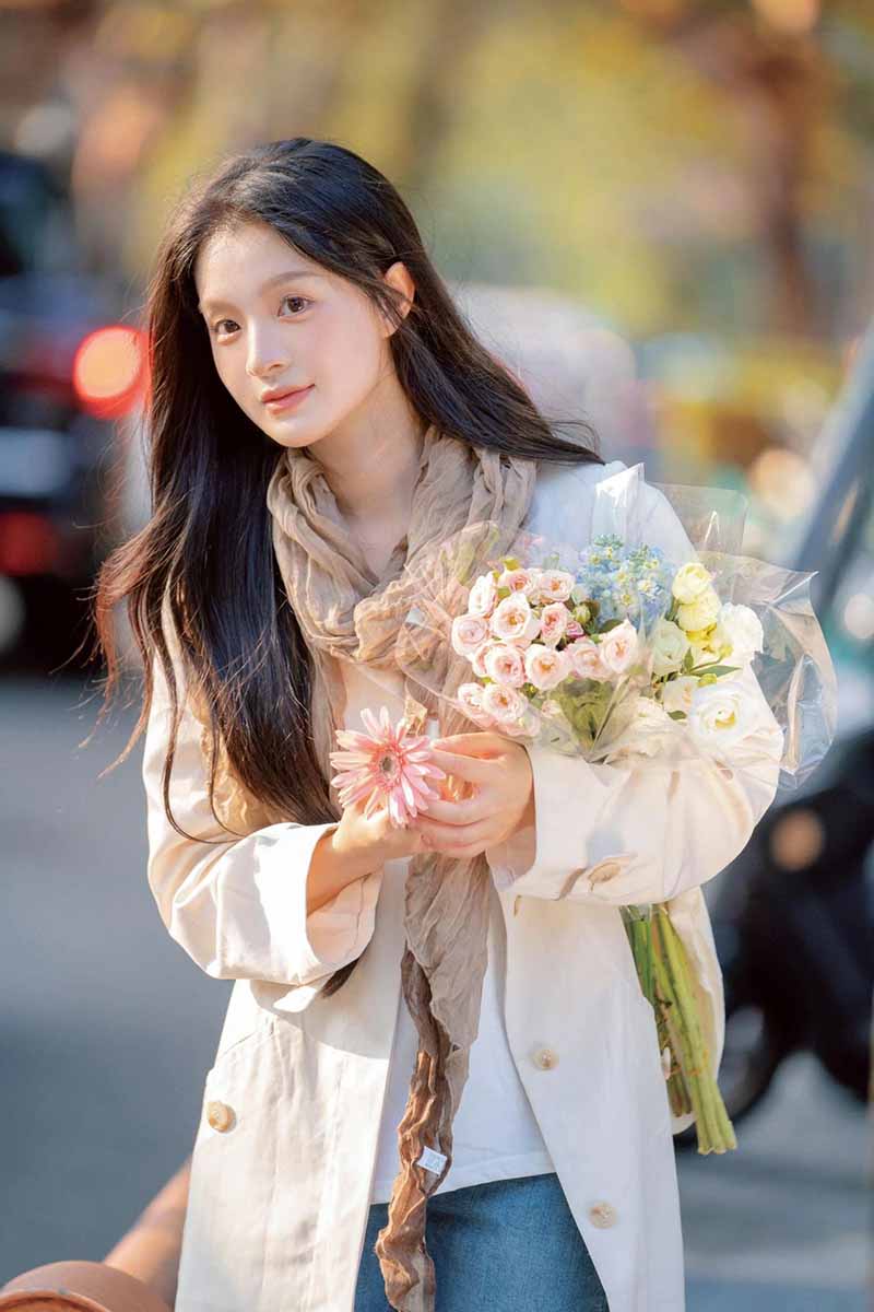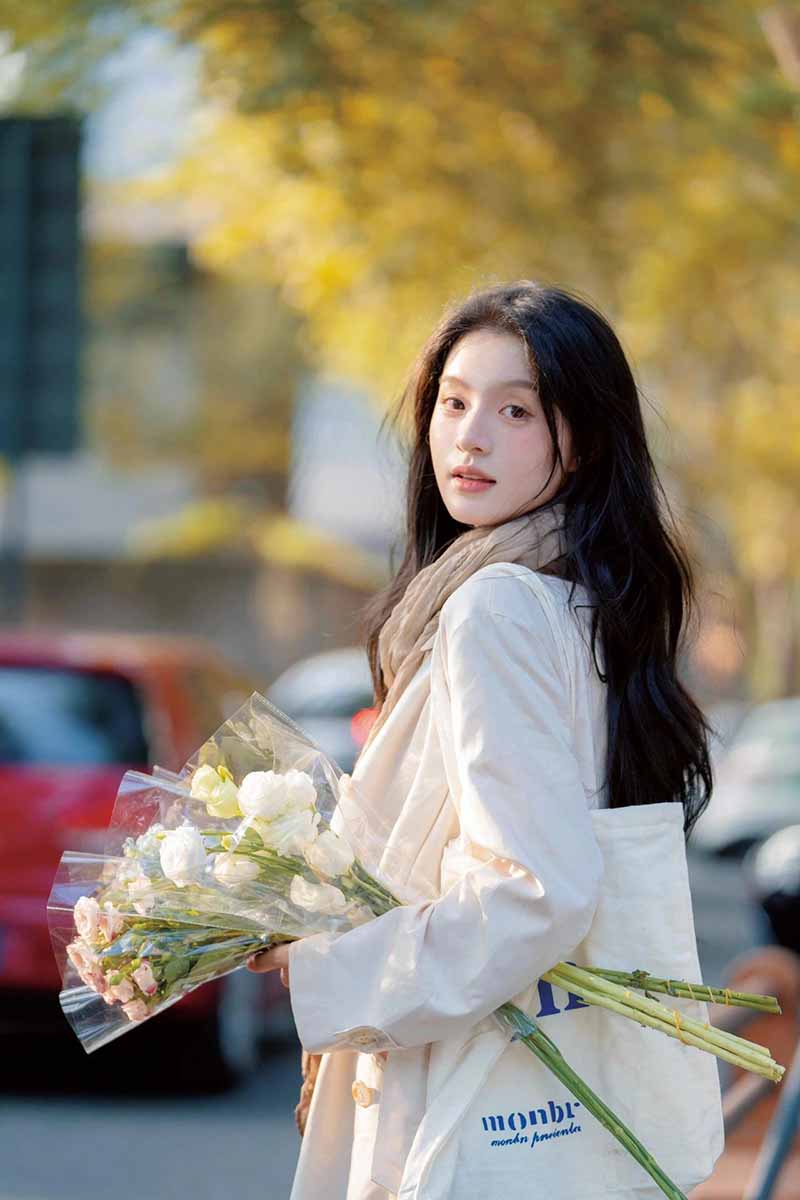 1、侧身回眸:让模特侧身站在街边,头微微回眸,看向远方,手中捧着鲜花,营造出一种优雅、文艺的氛围。